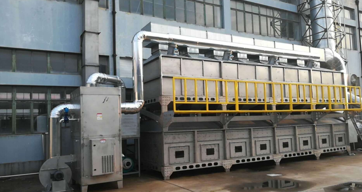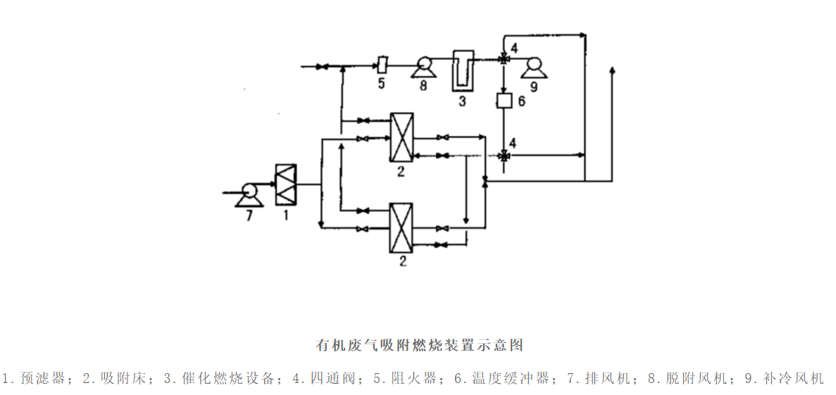 低濃度的有機廢氣通過新型活性炭(多為蜂窩炭)吸附濃縮,接近飽和后的活性炭經熱空氣加熱,將脫附出來的有機廢氣再經催化燃燒床進行無焰燃燒凈化處理,熱氣體在系統(tǒng)中循環(huán)使用或增設二級換熱器回收熱能。此法通過活性炭將低濃度的有機廢氣濃縮成高濃度的有機廢氣,再經過催化燃燒從而達到徹底凈化的目的。