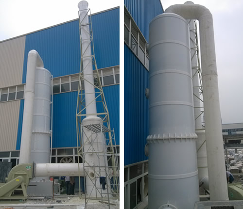 凈化塔內添加一定的填料,這樣可以使得廢氣和吸收液充分接觸,從塔上部流下來的水再通過水泵提升到塔頂,不斷循環(huán)使用,循環(huán)液(氫氧化鈉溶液)在達到一定濃度后再排向污水處理系統(tǒng)統(tǒng)一排放,吸收劑采用硫酸。